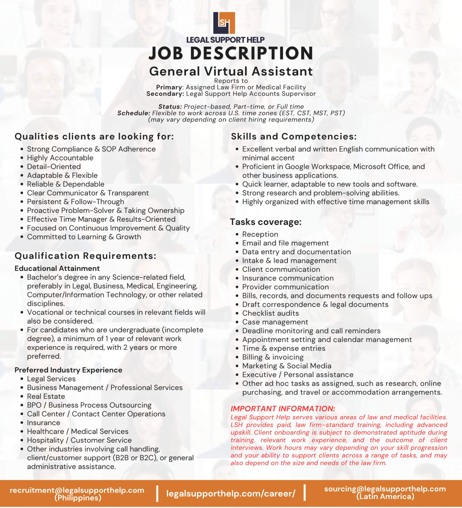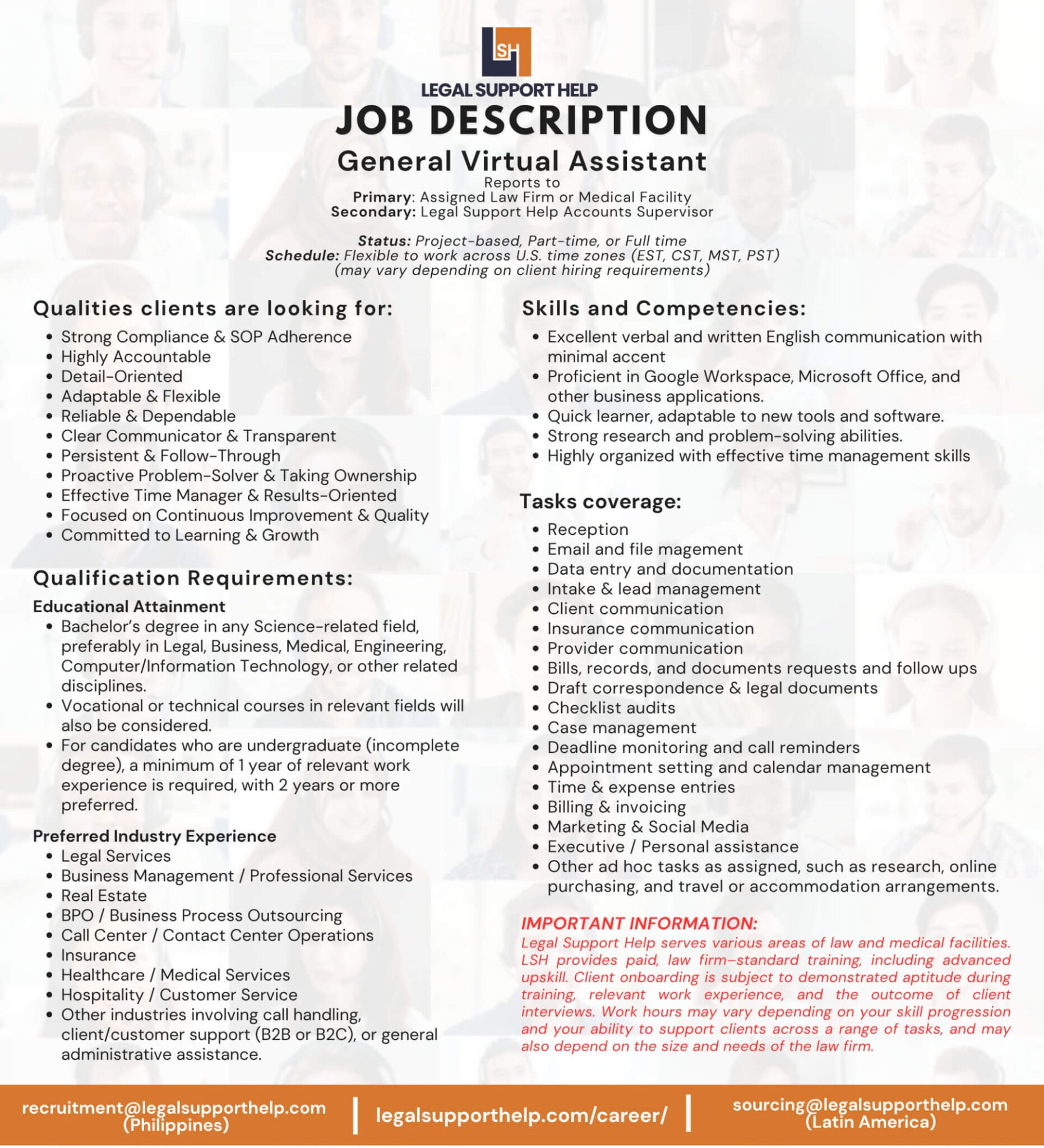 We are not just client-oriented. We also ensure that our Virtual Assistants receive the best possible training, support, and incentives so they can continuously grow their career with us and build a long-term relationship with their assigned clients.